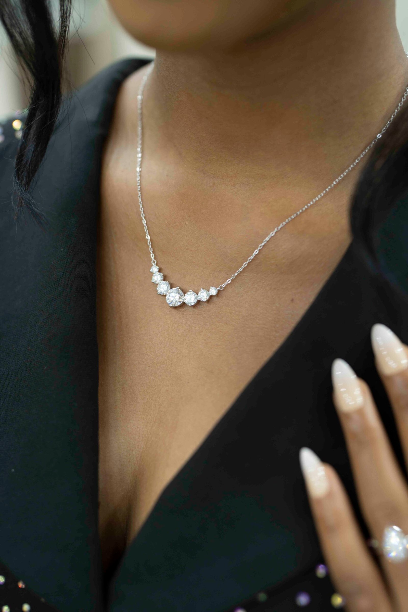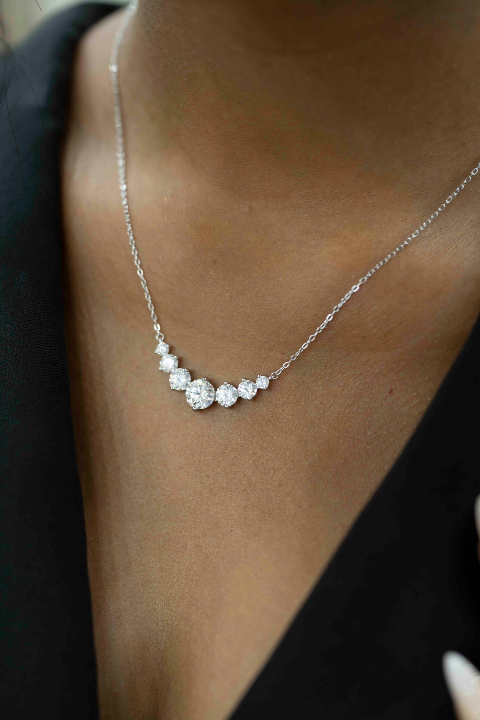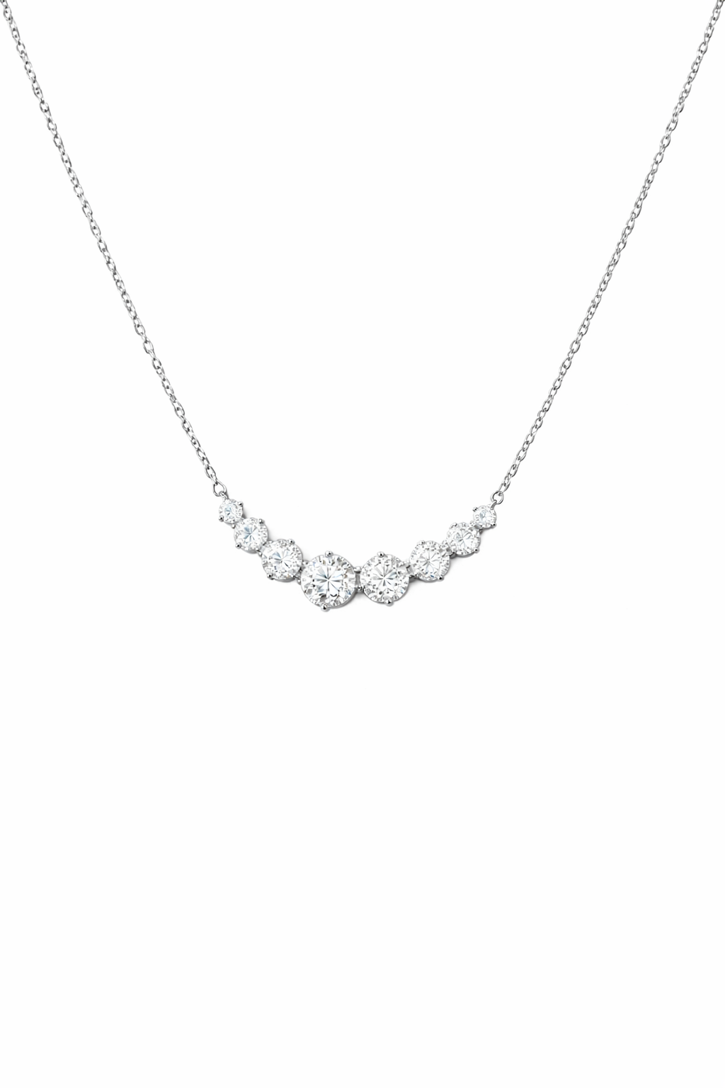 Elegant and effortlessly refined, the Graduated Moissanite Necklace is designed to illuminate the neckline with a delicate arc of brilliance. A series of round brilliant-cut stones are arranged in a graceful graduated design, with the centre stones subtly larger to create a balanced and eye-catching sparkle.