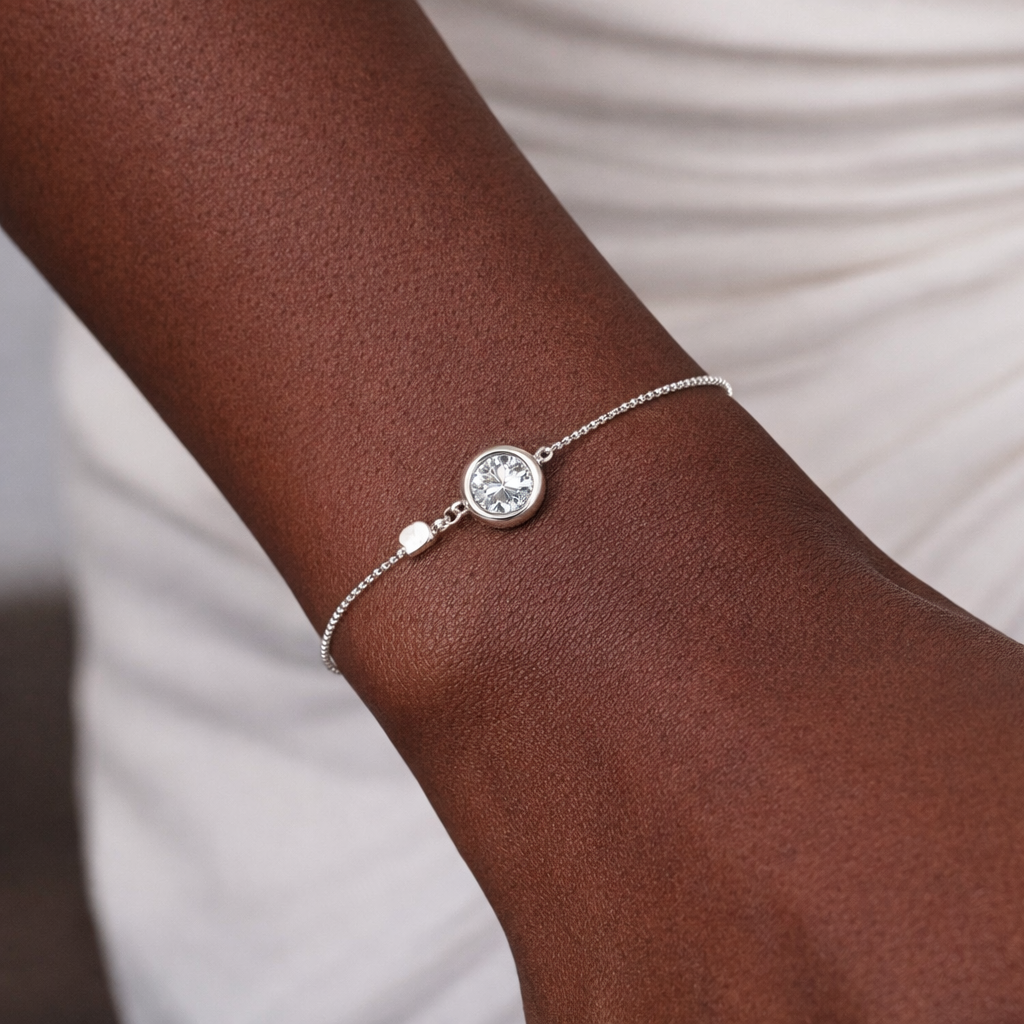 Delicate, elegant, and effortlessly refined, this bezel set diamond bracelet is designed for timeless sophistication. At the centre sits a brilliant round-cut diamond, beautifully encased in a smooth bezel setting that enhances the stone’s sparkle while providing a sleek, modern look.