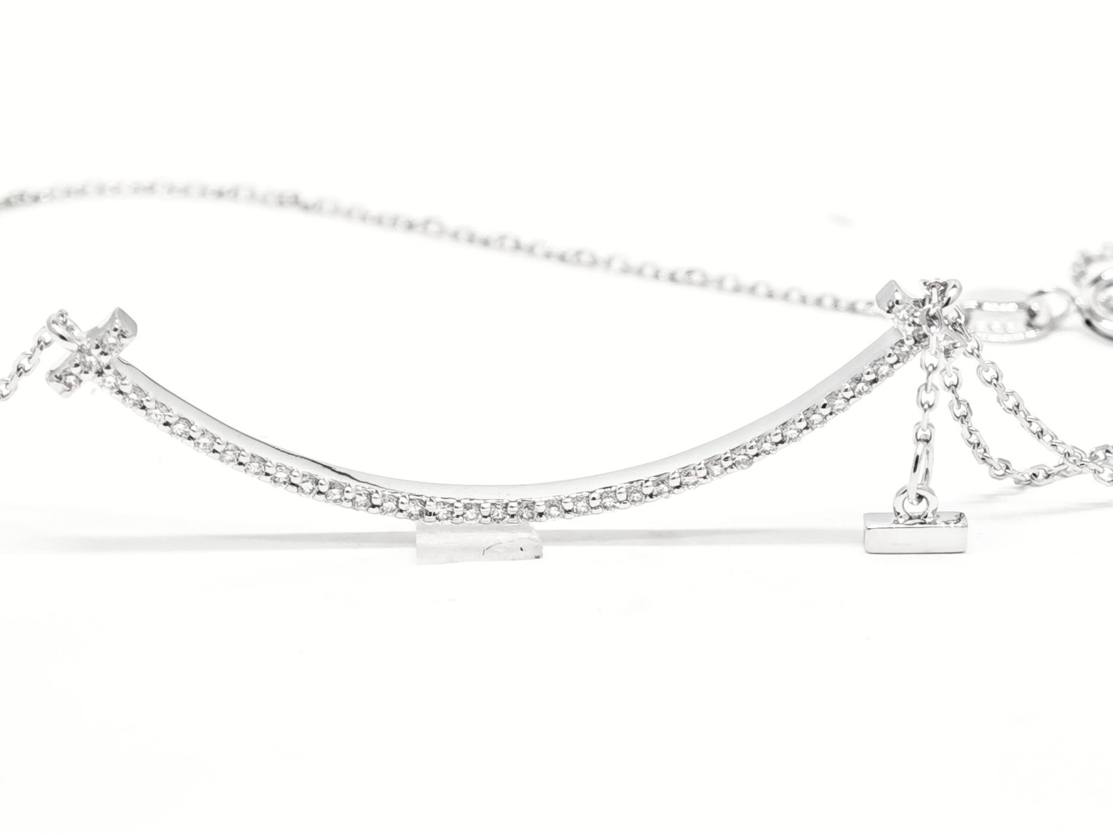 Crafted in polished white gold and suspended from a fine adjustable chain, the pavé-set diamonds catch the light beautifully, adding a subtle shimmer to any look. The soft curve of the design enhances its refined simplicity, making it perfect for both everyday wear and special occasions.