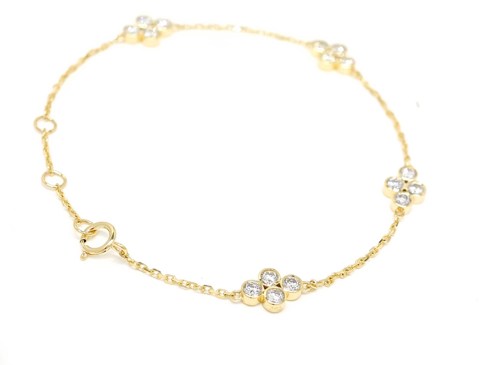 Delicate and effortlessly elegant, this refined bracelet is crafted in warm 9K yellow gold and adorned with sixteen finely cut diamonds, each measuring 2.25mm. The diamonds are arranged in subtle cluster motifs along a fine gold chain, creating soft points of sparkle that catch the light with every movement.