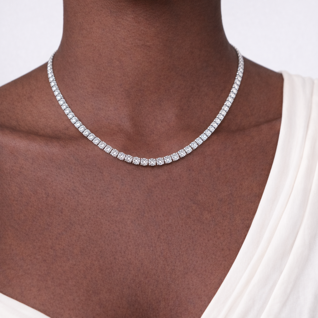 A timeless icon of elegance, the Diamond Tennis Necklace is the ultimate expression of refined luxury. A continuous line of brilliant-cut diamonds encircles the neckline, creating a seamless flow of light and sparkle with every movement.