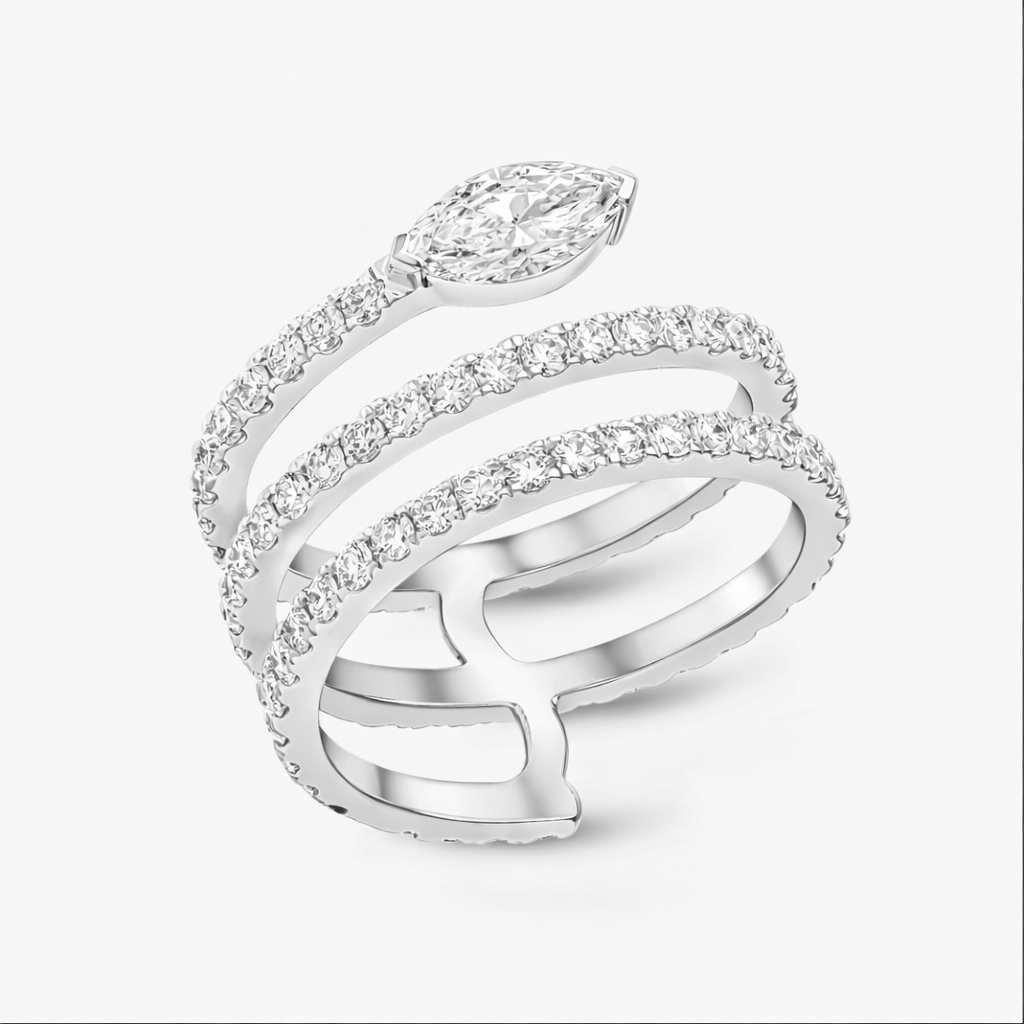 Three flowing bands sweep around the finger in a modern wrap design, each adorned with shimmering pavé diamonds totalling 1.2 carats. The layered silhouette adds depth, brilliance, and contemporary elegance while allowing the marquise centre stone to appear beautifully elevated.