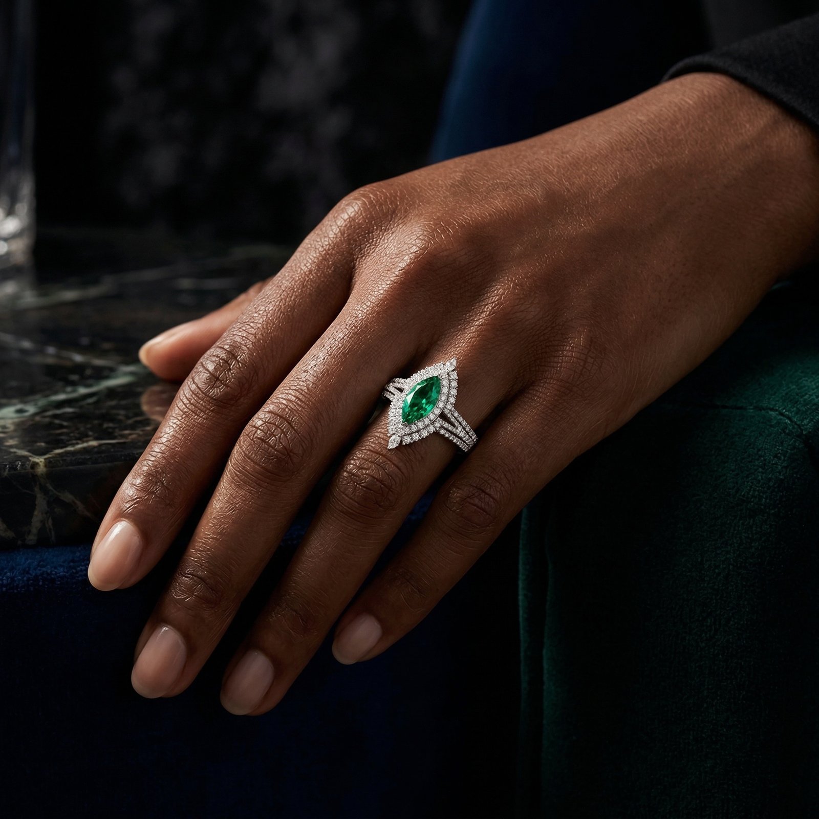 A striking balance of colour and brilliance. This elegant ring features a 1ct marquise-cut emerald, celebrated for its rich, vivid green hue. The centre stone is embraced by a shimmering halo of 1.5mm diamond side stones, meticulously set on polished 9K gold to enhance its graceful silhouette.