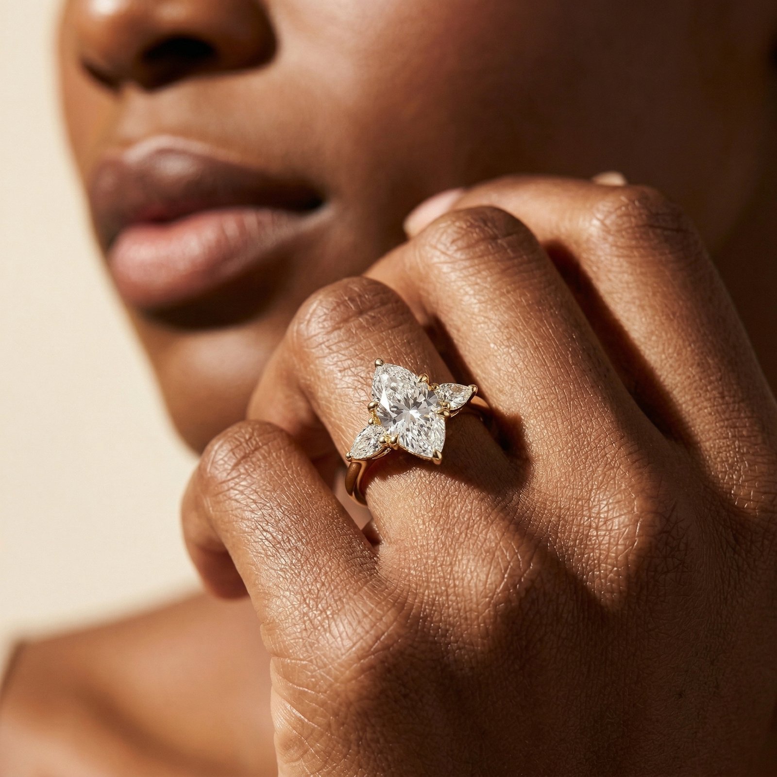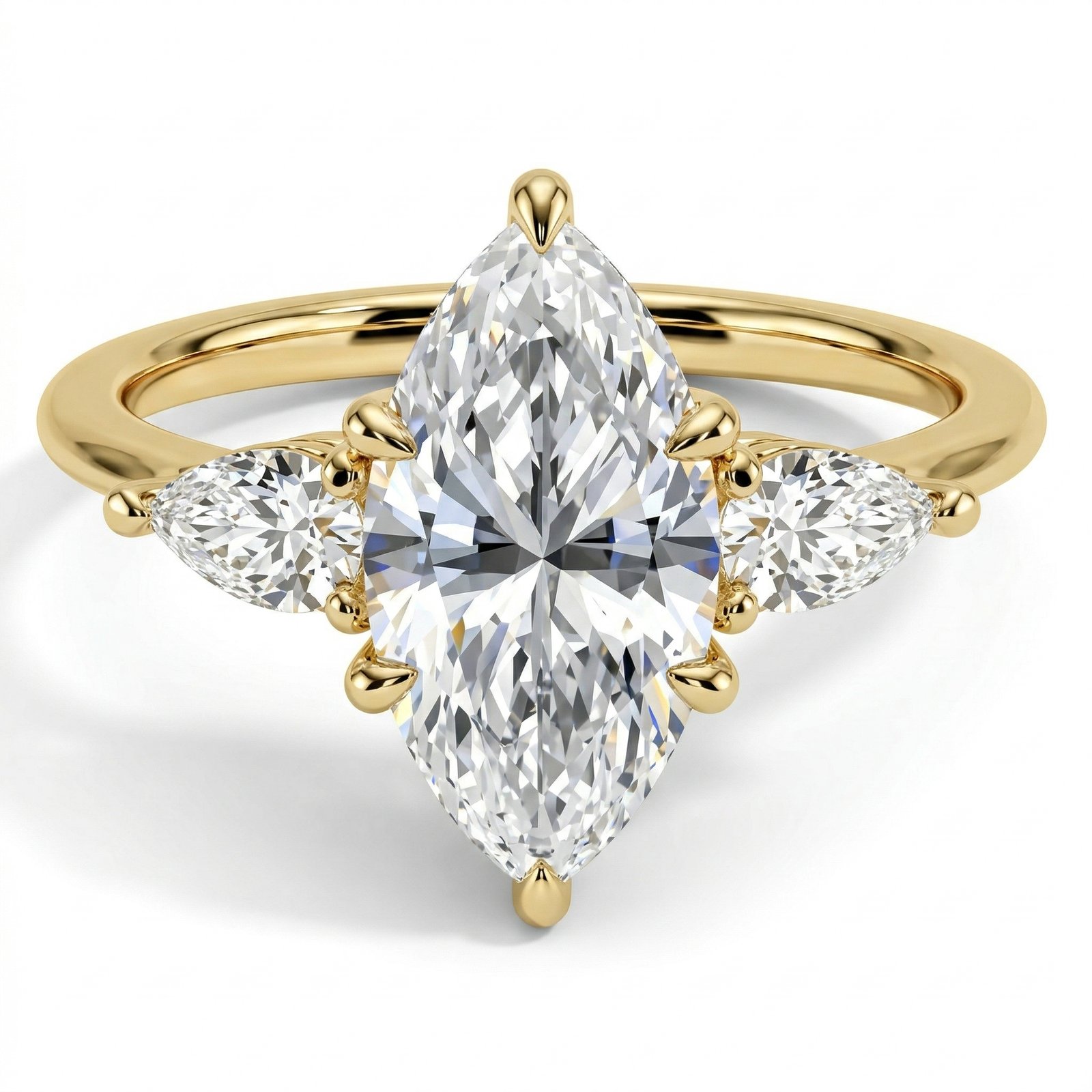 Bold, elegant, and unmistakably distinctive, this ring is designed to make a lasting impression. At its centre sits a striking marquise-cut moissanite, prized for its elongated silhouette and exceptional brilliance, creating a graceful, finger-lengthening effect.