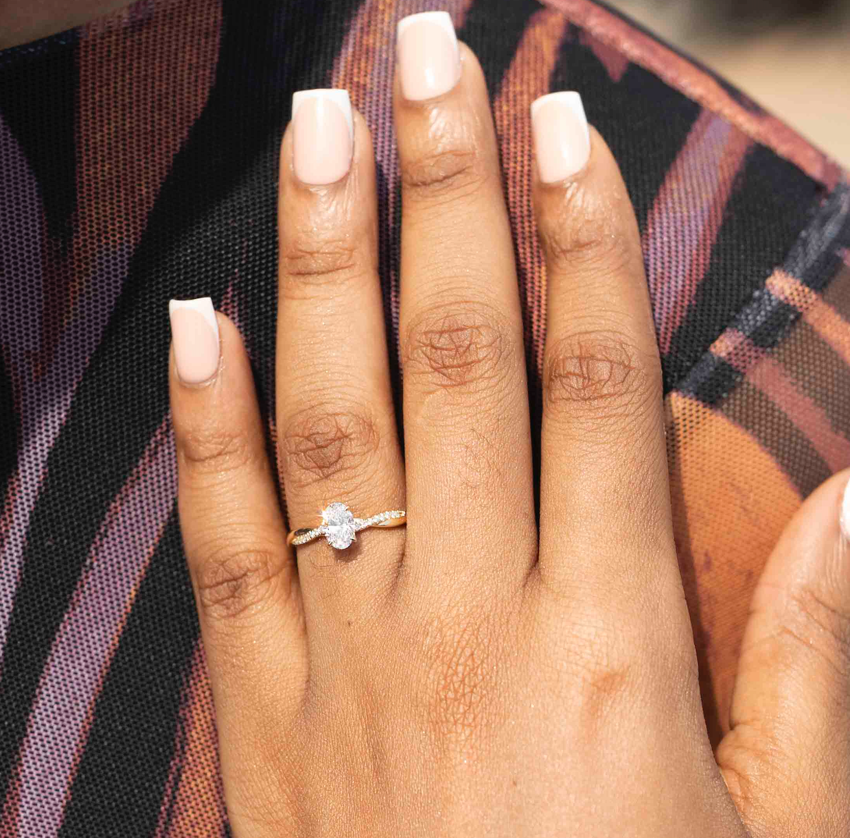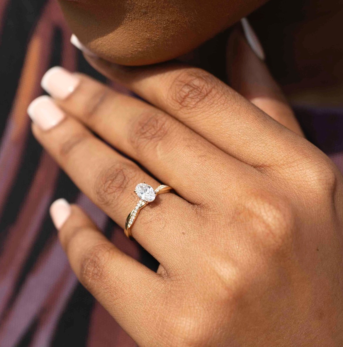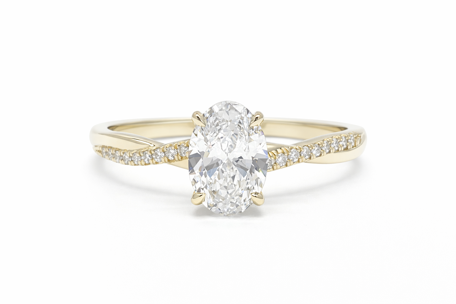 Delicately set diamond side stones, totalling 0.212ct, sweep along the band, adding subtle sparkle and perfectly complementing the refined oval centre. The classic four-prong setting allows light to flow freely through the diamond, enhancing its natural radiance.