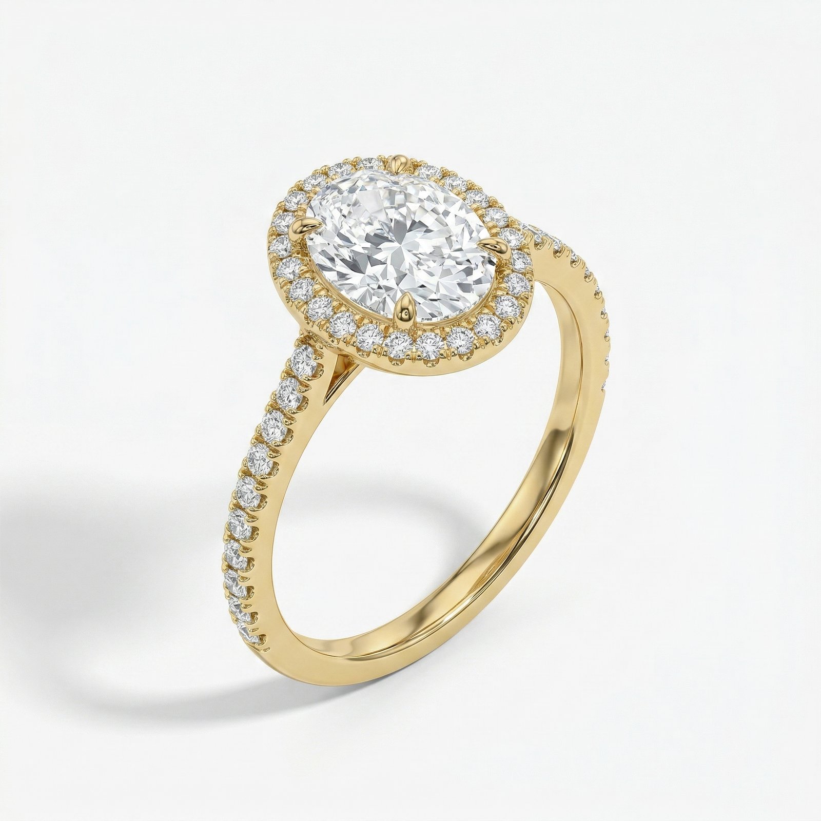 Encircling the centre stone is a delicate halo of pavé-set moissanite, designed to enhance its size and amplify its sparkle. The slender band, also adorned with shimmering stones, adds a continuous brilliance that catches the light from every angle while maintaining a refined and graceful profile.