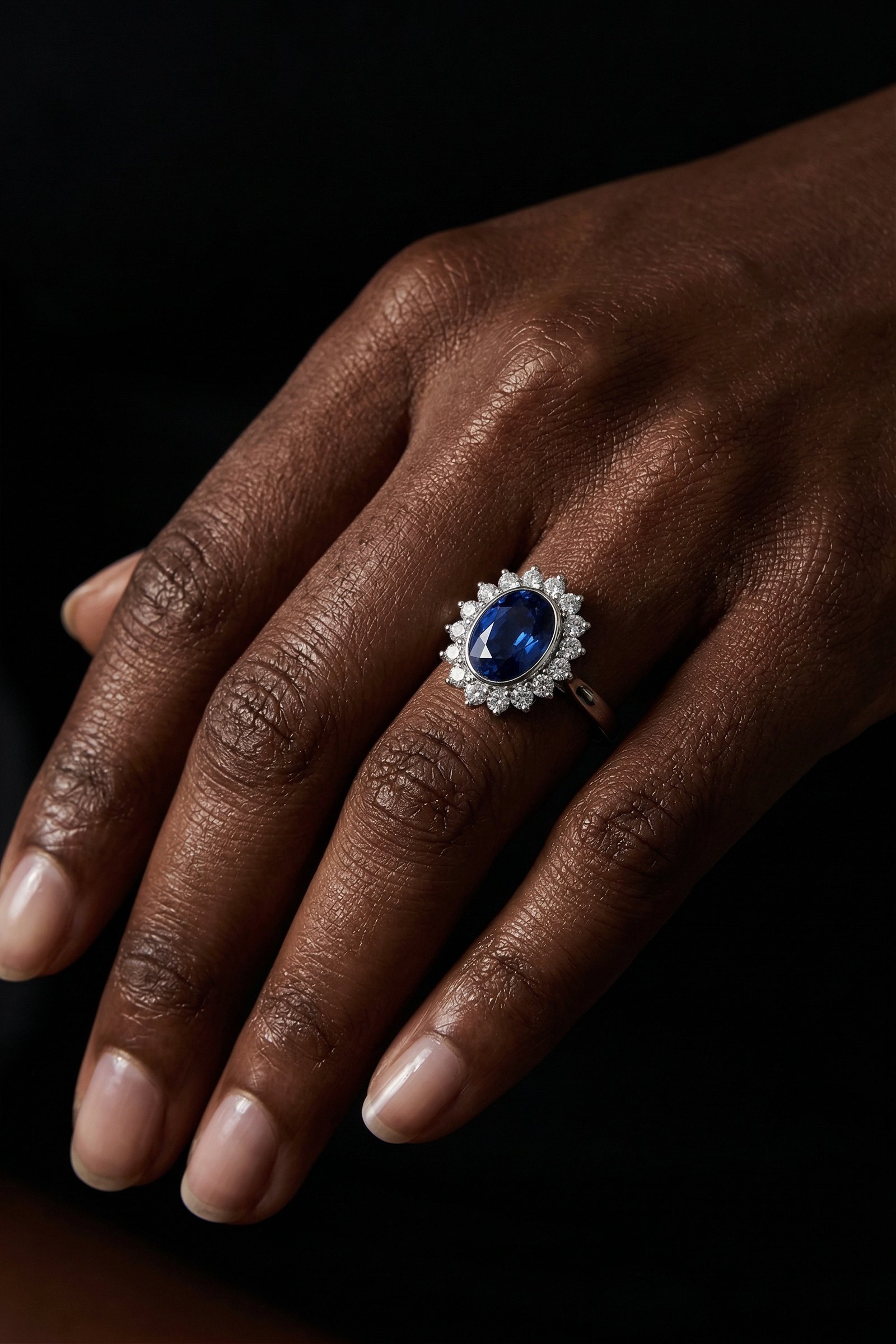 The oval silhouette elongates beautifully on the finger, while the diamond halo enhances the sapphire’s royal glow, creating a stunning centrepiece worthy of admiration.