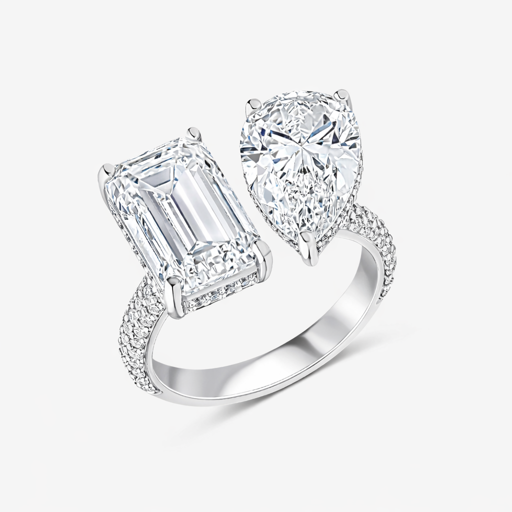 A striking expression of modern romance, this elegant Toi et Moi ring is crafted in 9K gold and designed to showcase two exceptional diamonds in perfect harmony. The design features a dazzling 1 carat pear-cut diamond paired with a sophisticated 2 carat emerald-cut diamond, symbolising the union of two unique forms and personalities.