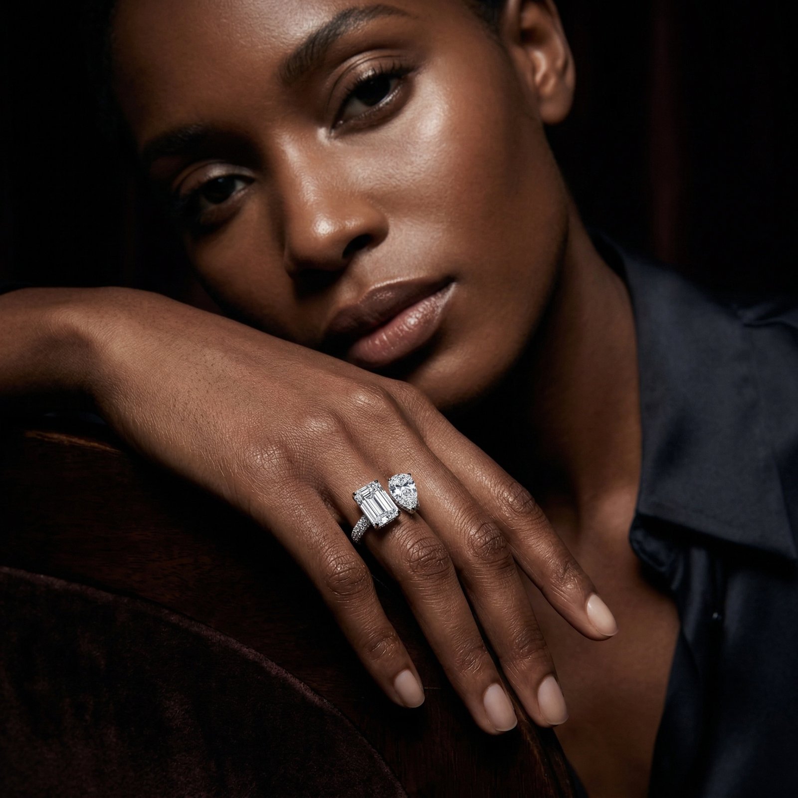 Both stones are gracefully set at an angle, creating a bold yet refined silhouette that captures light from every direction. The band is adorned with 0.7 carats of pavé-set diamonds, adding a continuous sparkle that enhances the brilliance of the centre stones.