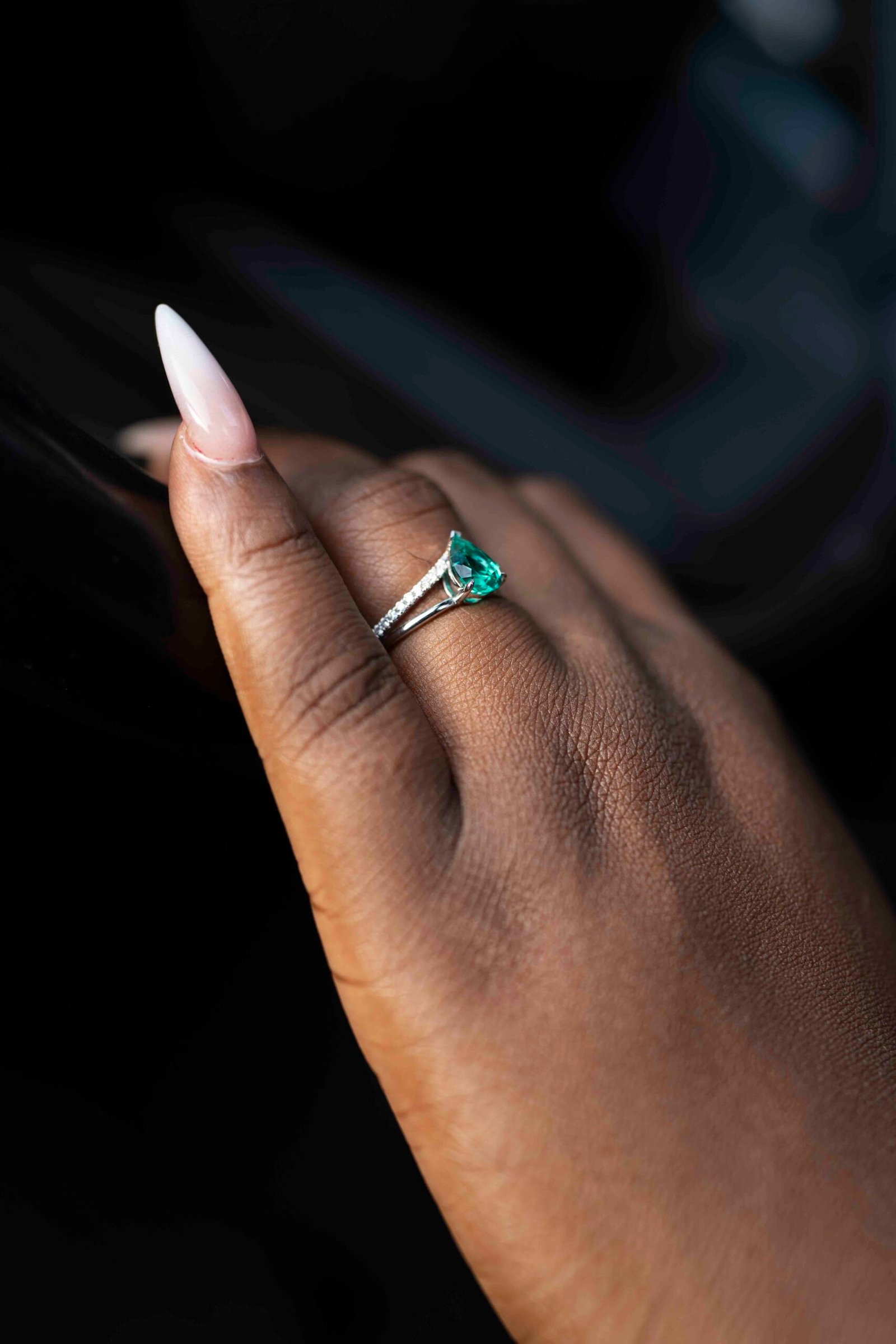 A graceful expression of luxury. This refined design features a 1ct pear-cut emerald, admired for its luminous green tone and elegant teardrop shape. Set on polished 9K white gold, the emerald is beautifully complemented by 1.5mm diamond side stones delicately lining the band.