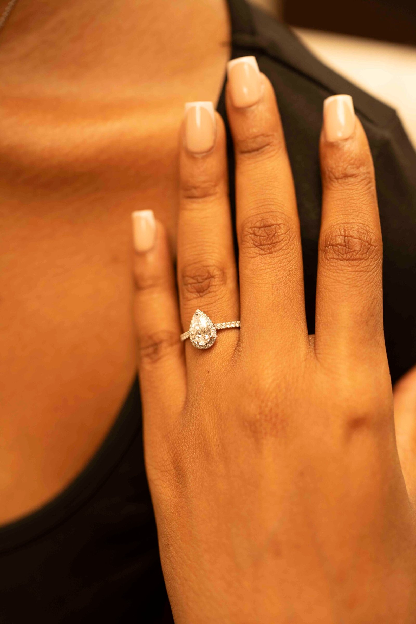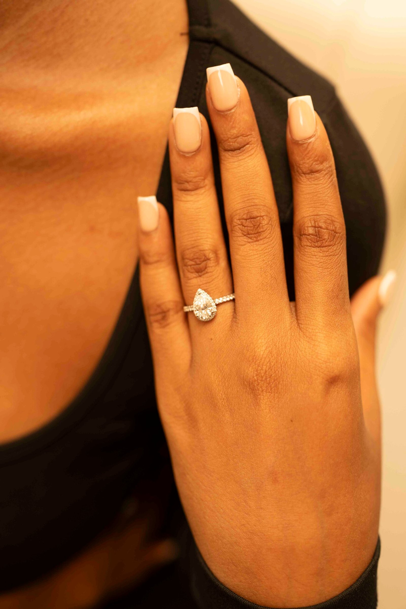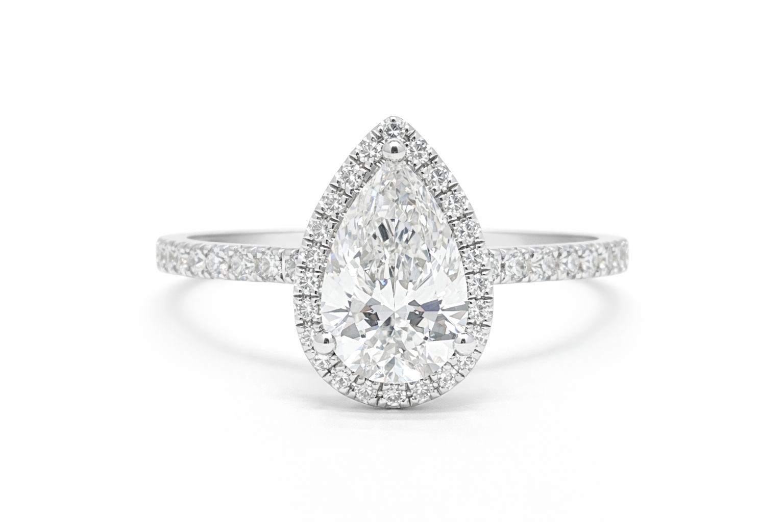 A delicate halo of pavé-set diamonds frames the pear-shaped centre, while additional diamonds flow along the band, creating continuous sparkle and enhancing the ring’s refined profile. The elegant setting allows light to enter from every angle, elevating the radiance of the centre stone