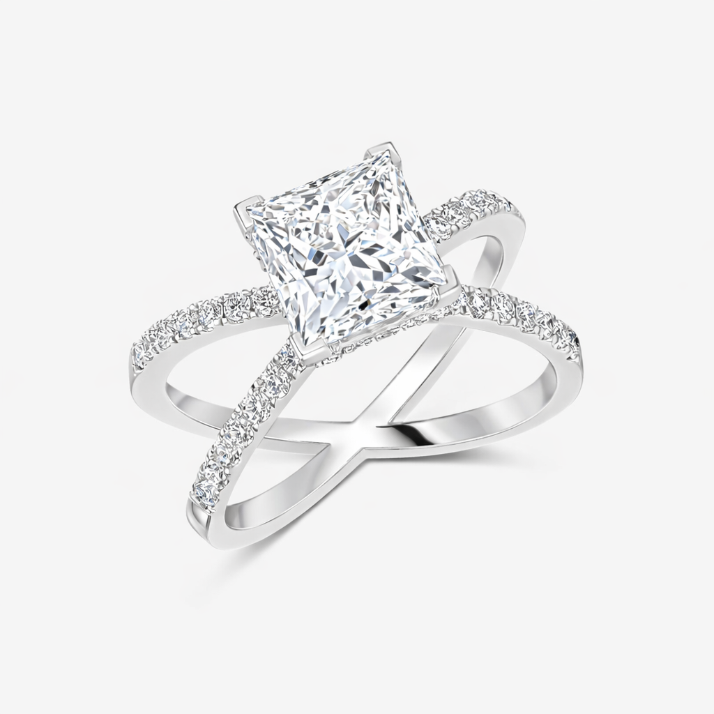 The distinctive crossover band gracefully wraps around the centre stone, creating a sculptural silhouette that enhances the diamond’s presence. Delicately set pavé diamonds along the flowing bands add an extra layer of sparkle, catching the light from every angle.