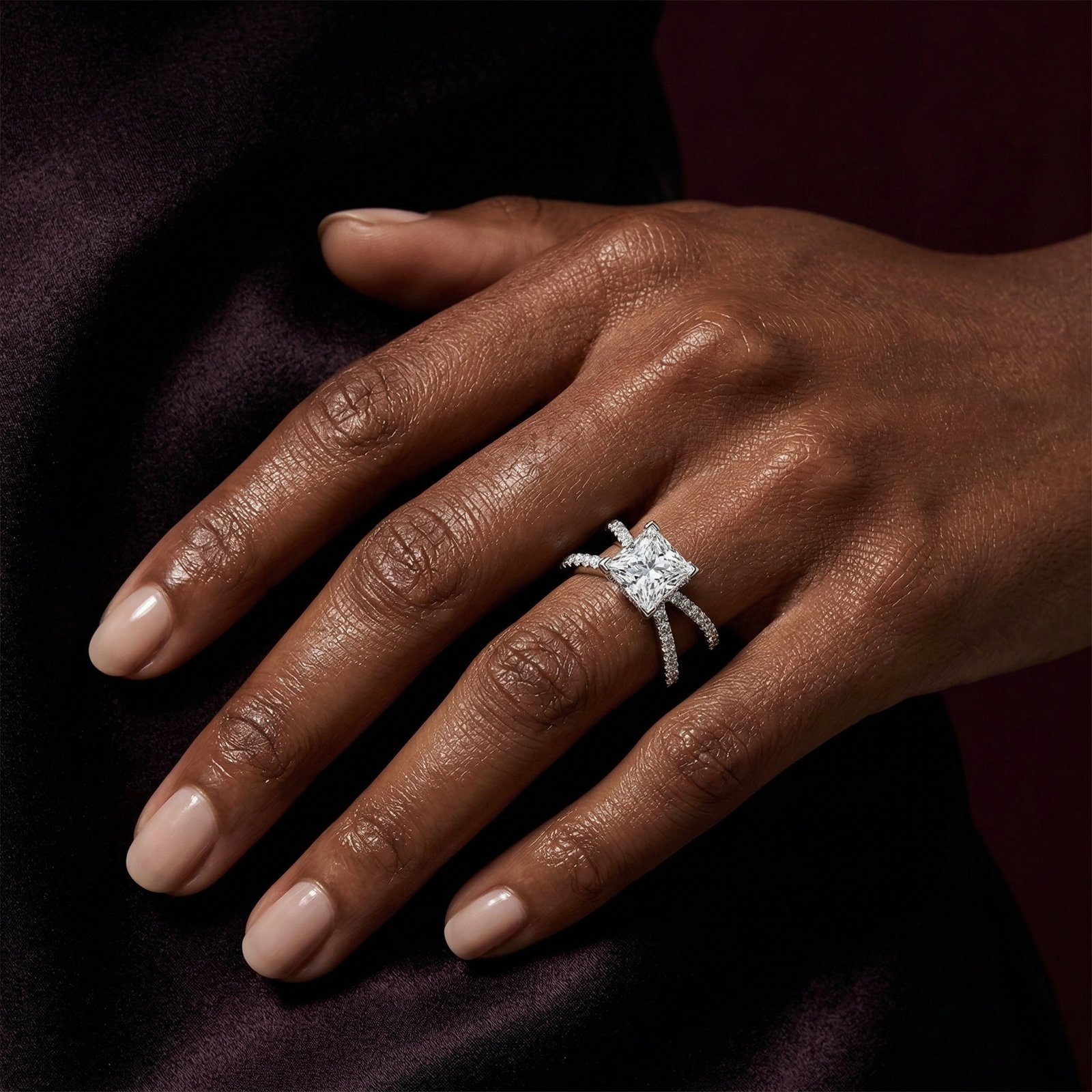 Bold yet elegantly refined, this contemporary ring is crafted in 9K gold and designed to make a striking statement. At its centre sits a dazzling 2 carat princess-cut diamond, celebrated for its sharp lines and exceptional brilliance.