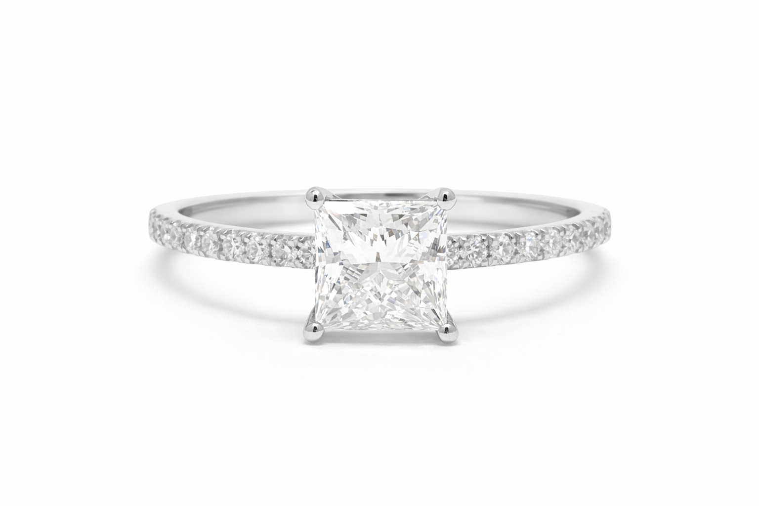 The band is adorned with pavé-set diamonds along the shoulders, adding a continuous sparkle and accentuating the beauty of the centre stone. The four-prong setting lifts the diamond, ensuring maximum light exposure for a radiant finish.