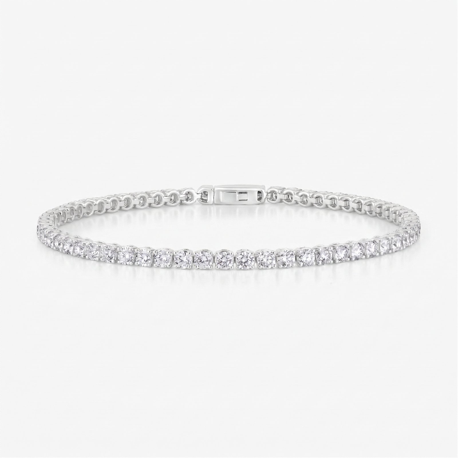 Crafted in polished white gold, the classic tennis design offers both sophistication and versatility. The sleek setting allows each diamond to catch the light beautifully, while the secure clasp ensures a comfortable and reliable fit for everyday wear.
