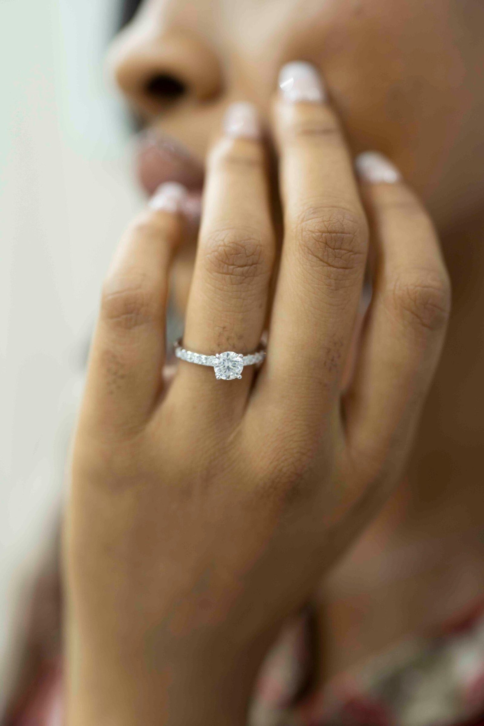 Delicately set side stones flow along the band, while a refined halo of moissanite encircles the neck of the setting, enhancing sparkle from every angle and elevating the centre stone with added depth and dimension. The classic four-prong setting lifts the stone gracefully, allowing maximum light to pass through for a radiant finish.
